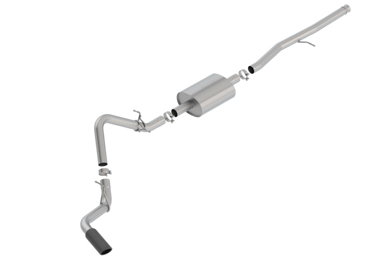 Factory Side Exit ONLY. This system features a Black Chrome on T-304 stainless steel tip and the S-Type sound level. Using BORLA? Stainless Steel Polish p# 21461 is NOT recommended with these black chrome tips. We suggest cleaning the tips with hot water and a microfiber cloth. Add Adapter 60706 For Crew Cab Standard Bed (6' 7") 157" Wheelbase Vehicles. Replace the muffler behind the primary muffler in the BORLA? "S-Type" system with this Polyphonic Harmonizer to attain the "ATAK?" sound level (louder than "S-Type"). Each system is built from premium, high-quality T-304 austenitic stainless steel, superior to T-400 to give you the absolute best in performance and durability. Ultra-smooth mandrel bends ensure maximum flow & power, and precision CNC manufacturing ensures an accurate fit. You can count on BORLA? to provide durability, performance, sound, and a Million-Mile Warranty. See separate note about warranty on tip finish.
